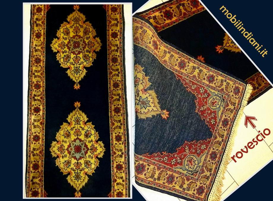Passatoia persiana Saruq (o Saruk) Epoca prima metà XX Secolo. Fondo "blu Persia" intenso, medaglioni centrali e bordura floreale color crema. Cm.230x75 Tappeto pregiato di solidità struttura, lana soffice, eccellente e compatta (vedi foto) caratteristiche che li hanno resi famosi in tutto il mondo. Il tappeto Saruq, rientra nelle categorie più alte di tappeti persiani. COSTO TRASPORTO €. 29,00 Iva Inclusa. Per costi trasporto Isole, chiedi info su WhatsApp o mail: info@mobilindiani.it