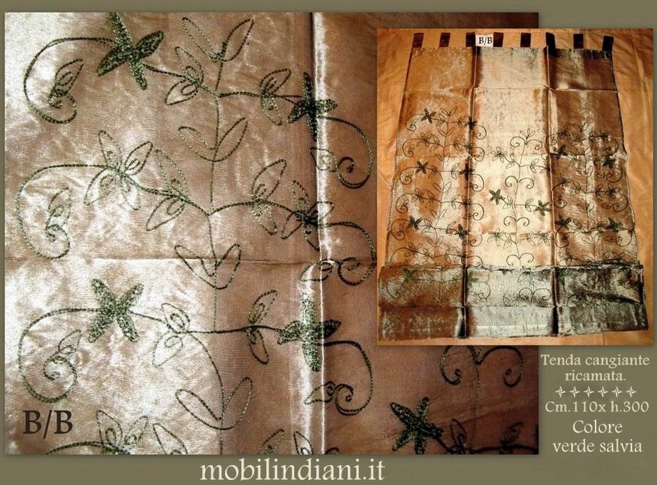Disponibilità 19Tenda etnica, tessuto velato cangiante, colore verde salvia, ricami eseguiti con filo di seta. Cm.110 h.300 incluso passanti. Paese India (lavaggio a secco) €.5,00/cd. - Acquisto minimo 4/pz. COSTO TRASPORTO PER 4/Pz. €. 8,80 Iva Inclusa